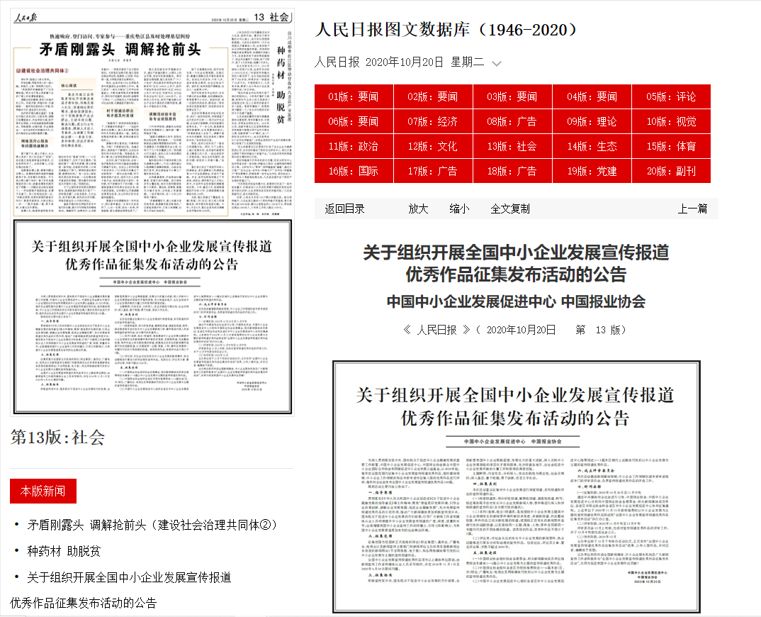 10月20日,《人民日報》第13版用半版版面刊發(fā)了《關(guān)于組織開展全國中小企業(yè)發(fā)展宣傳報道優(yōu)秀作品征集發(fā)布活動的公告》,人民網(wǎng)、學(xué)習(xí)強國等中央媒體和中宣部新媒體學(xué)習(xí)平臺及時對本項活動做了重點推薦,引發(fā)社會各界廣泛關(guān)注;截至發(fā)稿日,學(xué)習(xí)強國刊發(fā)此項活動的公告消息稿,瀏覽量達(dá)6萬多人次,收獲點贊數(shù)2000多個。